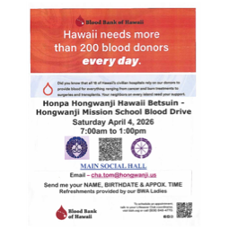 If you are open to it, we would greatly appreciate it if this could be shared in your school newsletter or via a student announcement. Thank you for your continued leadership and for considering this opportunity for our schools to work together for our local community. With gratitude, Charlyne Tom Site Coordinator Hongwanji Mission School | | OFFICE HOURS 7:30 AM - 5:00 PM Closed April 8 - Buddha Day April 10 - Teacher In-service Day | | |