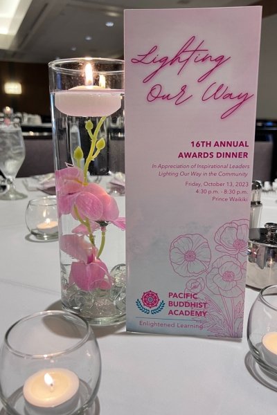 The Baccalaureate Service is a spiritual event celebrating each student’s achievements in their studies of Buddhist values. This service culminates with the offering of a custom-made shikisho (representing the study of Buddhism) presented by the Bishop. The service is held at the Hondo, or main temple, of the Honpa Hongwanji Hawai‘i Betsuin.